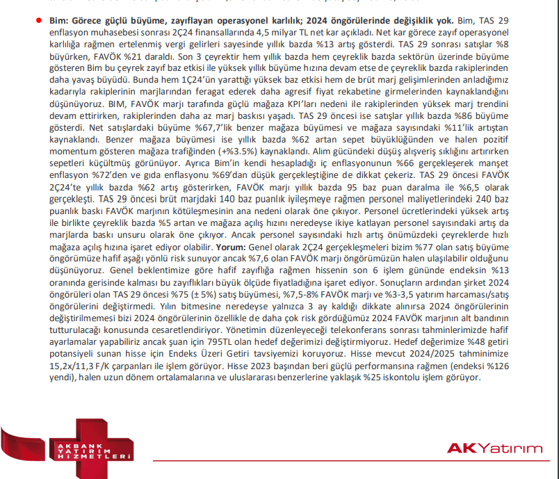 Her dört analiz de BİM’in 2024 ikinci çeyrekteki finansal performansını farklı açılardan ele almakta ve genel olarak şirketin karlılık göstergelerindeki düşüş ile satış gelirlerindeki artış arasında bir denge kurmaya çalışmaktadır. Yatırım kuruluşlarının revize edilen hedef fiyatları, şirketin pazar pozisyonu ve operasyonel stratejileri hakkında pozitif bir görünüm sunarken, operasyonel maliyetler ve FAVÖK marjındaki düşüşler belirli endişeleri de beraberinde getirmektedir.