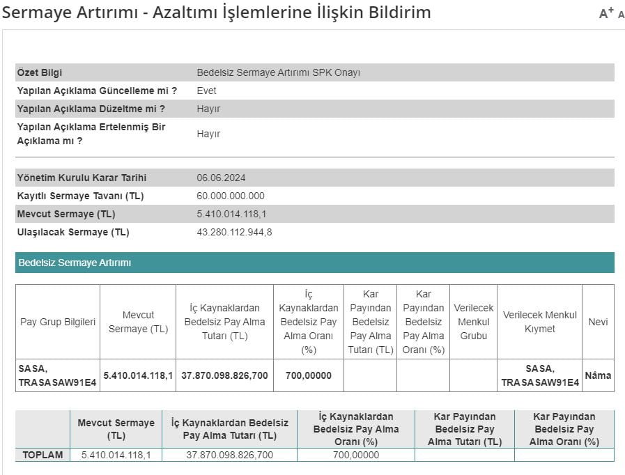 Şirketin Yönetim Kurulu tarafından 6 Haziran 2024 tarihinde alınan karar doğrultusunda, sermaye artışının tamamı iç kaynaklardan karşılanacak ve artırılan tutar 37.870.098.826,70 TL olacak. Bu doğrultuda, SASA’nın Esas Sözleşmesi’nin 8. maddesi tadil edilmek suretiyle gerekli düzenlemeler yapılacak.