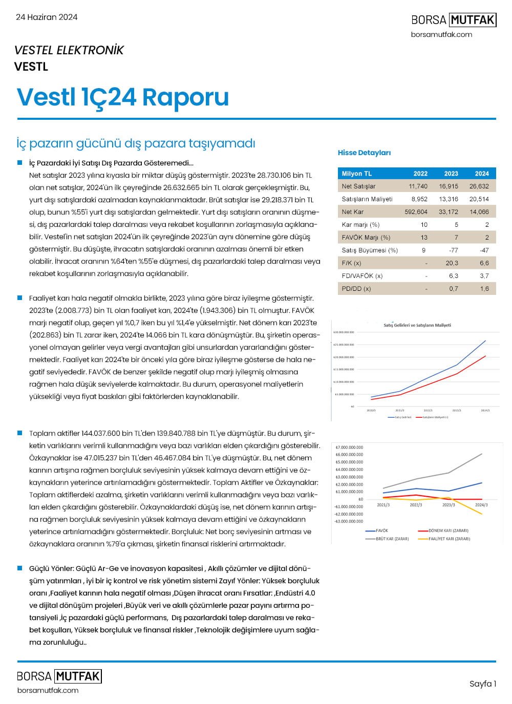 Vestel Elektronik’in 1 Ocak – 31 Mart 2024 dönemi faaliyet raporu incelendiğinde, genel finansal performansı ve operasyonel faaliyetleri hakkında önemli noktalar öne çıkmaktadır. Bu değerlendirme, şirketin genel durumunu, güçlü ve zayıf yönlerini, fırsatlarını ve karşılaştığı tehditleri anlamamıza yardımcı olacaktır.